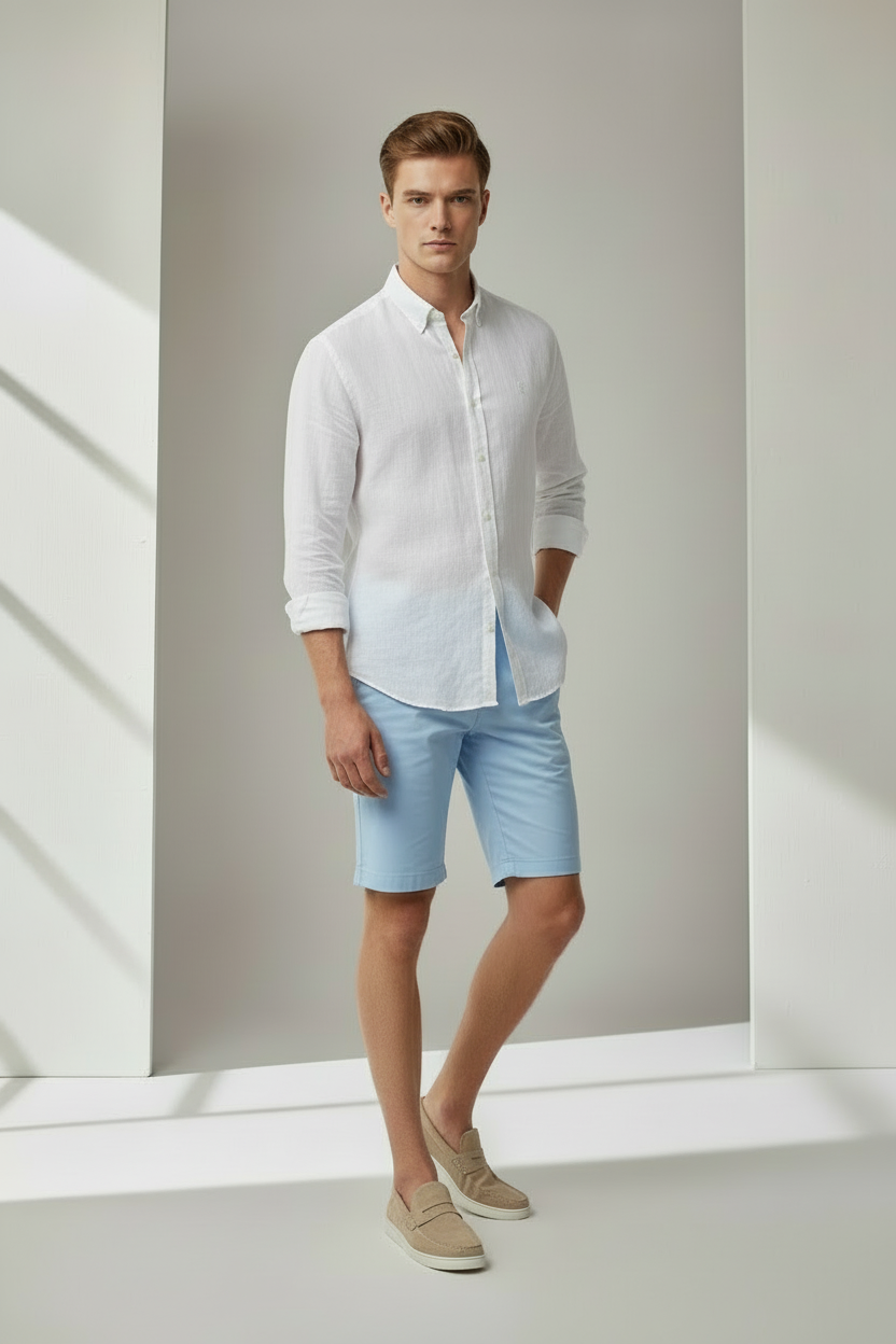 Este pantalón corto es la evolución funcional del chino clásico. Está confeccionado en una mezcla de 98% algodón de alta calidad y un 2% de elastano, una proporción técnica que mantiene la apariencia firme del algodón pero añade la flexibilidad necesaria para el movimiento diario. El interior está rematado con costura francesa, un detalle de confección que oculta los bordes del tejido para eliminar roces y aumentar la durabilidad de la prenda.